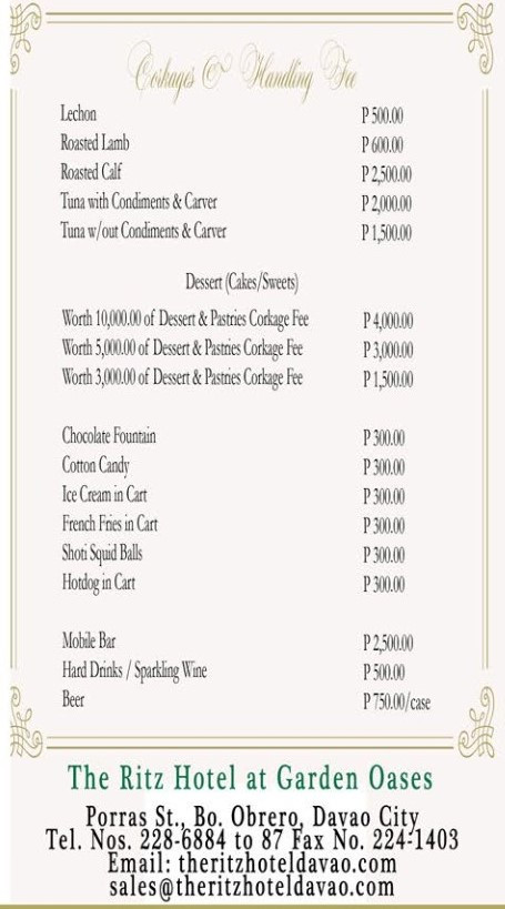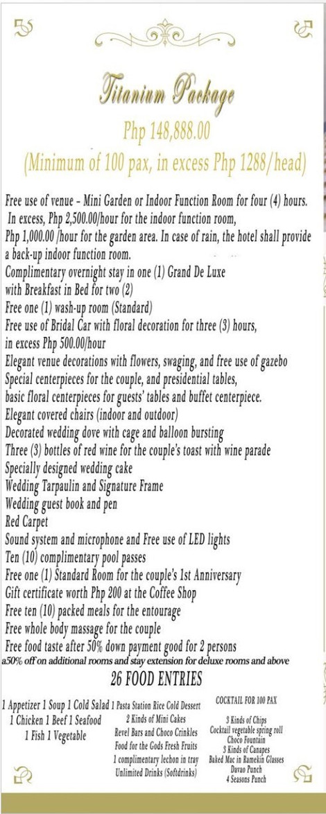 To help you with your wedding planning, here are the list of other hotels that made it to my shortlist and some more that are within Davao City. (All rates are subject to change without prior notice. For more accurate quotations, please contact the hotel directly on the respective contact info given)