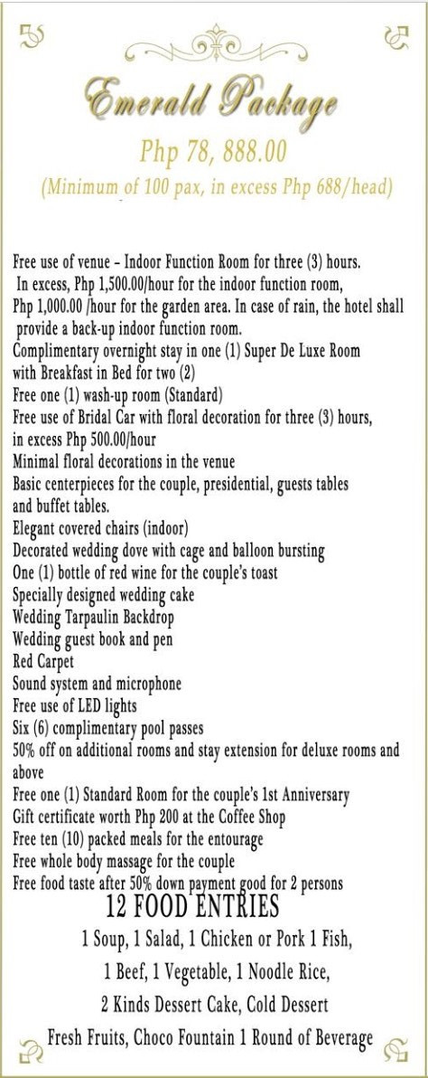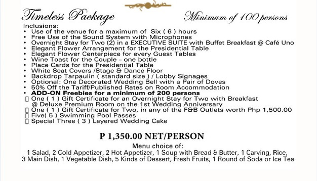 This hotel's wedding package has lots of inclusions that all you actually need to do is get there on time. Honestly this hotel's package comes with food, venue, photography, souvenirs, and lots more. If you are the type of couple who wants no "wedding stress" at all, then this is the wedding package that's perfect for you.